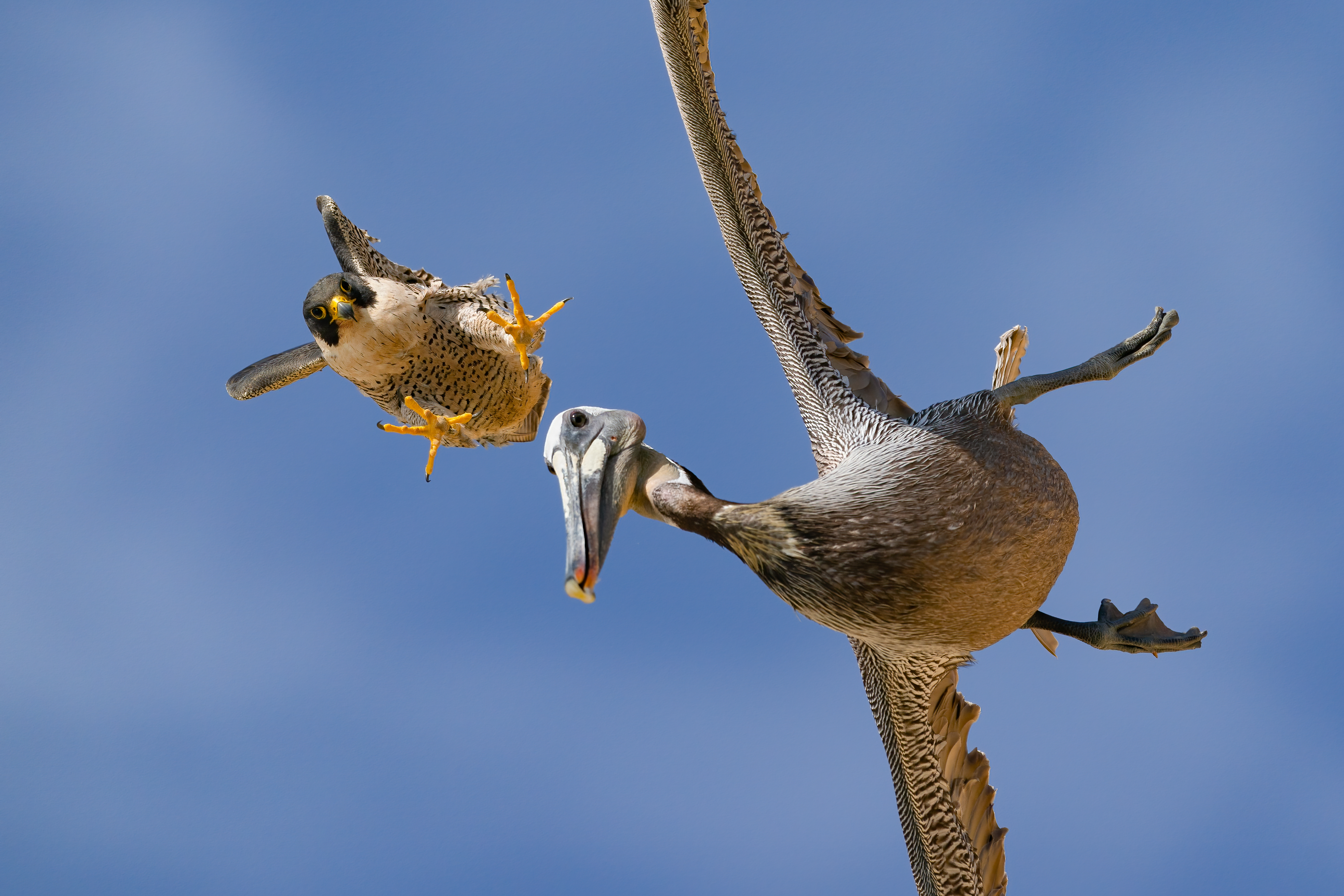 On a cliff in the wild, peregrine falcons defend their nest from larger pelicans. The fastest birds on earth dive-bomb intruders with speed and agility, occasionally striking with fierce attacks. Though pelicans pose no threat to chicks, the falcons’ relentless protective instincts and alertness ensure safety for their offspring. On most occasions, the attacked pelicans manage to fly away but in some instances they are killed due to the high speed of the pursuit.